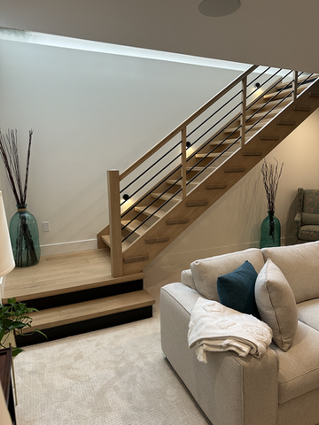 For this beautiful home we designed, manufactured, and installed a custom open rise staircase with horizontal rods and railings to give it a modern touch, also stain matching the stair to the flooring.